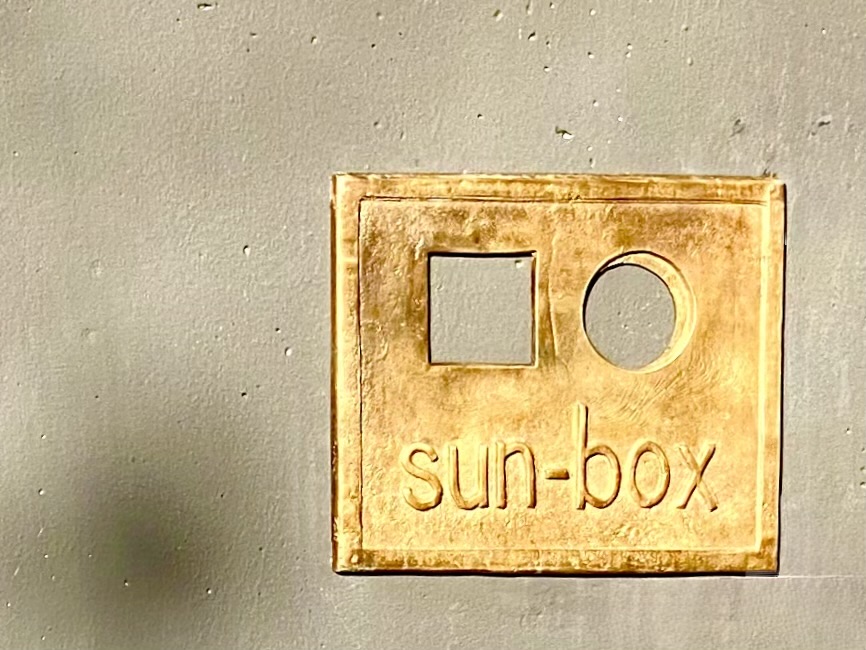 Nicht einmal 4 Wochen später hängt die Tafel an der Wand. Leichte Verzögerung da erst der Anstrich noch erneuert werden musste. Das grafische Motiv ist eine Verschmelzung aus dem Logo von PLANBROSI (Quadrat) und der eingetragenen Marke sun-box (Schriftzug mit Kreis als Metapher für die Sonne). Der Viertelmond ist zufällig entstanden. Der Rohguss wurde durch den Bildhauer Richard Gruber professionell nachbearbeitet (ziseliert, echt noch viel mehr Arbeit! fransiger Auslauf begradigt, fehlendes Material beigeschweißt, geschliffen, poliert, …) ansonsten „so belassen wie vorgefunden“.